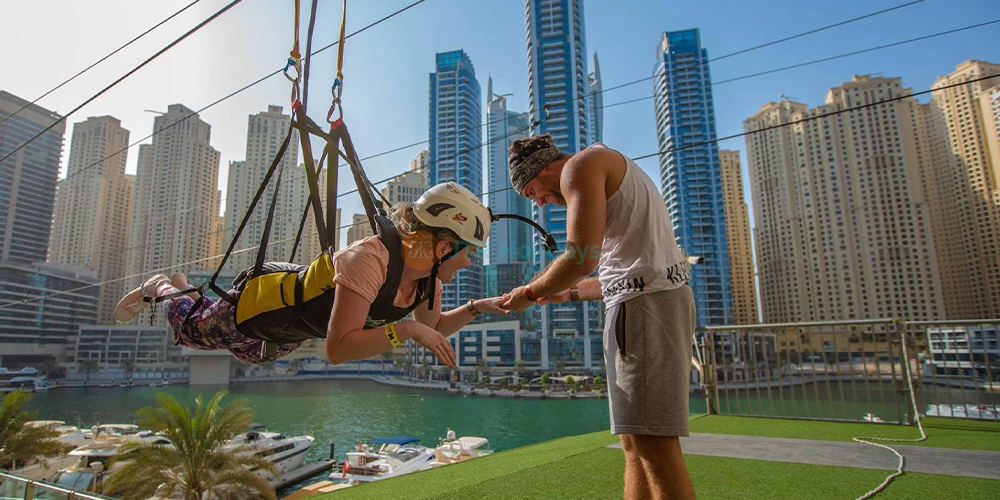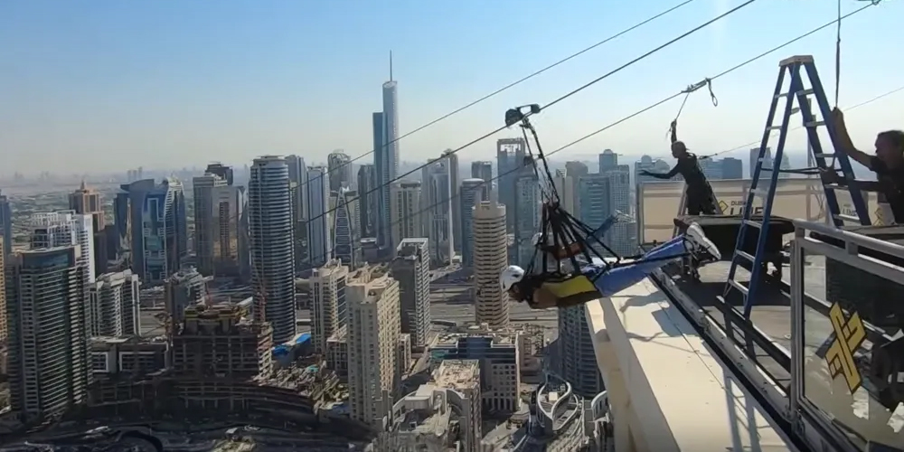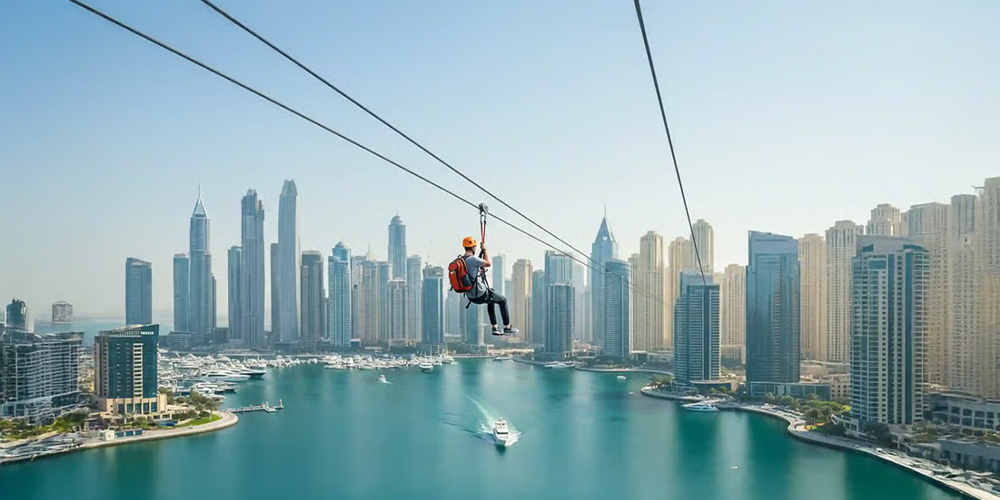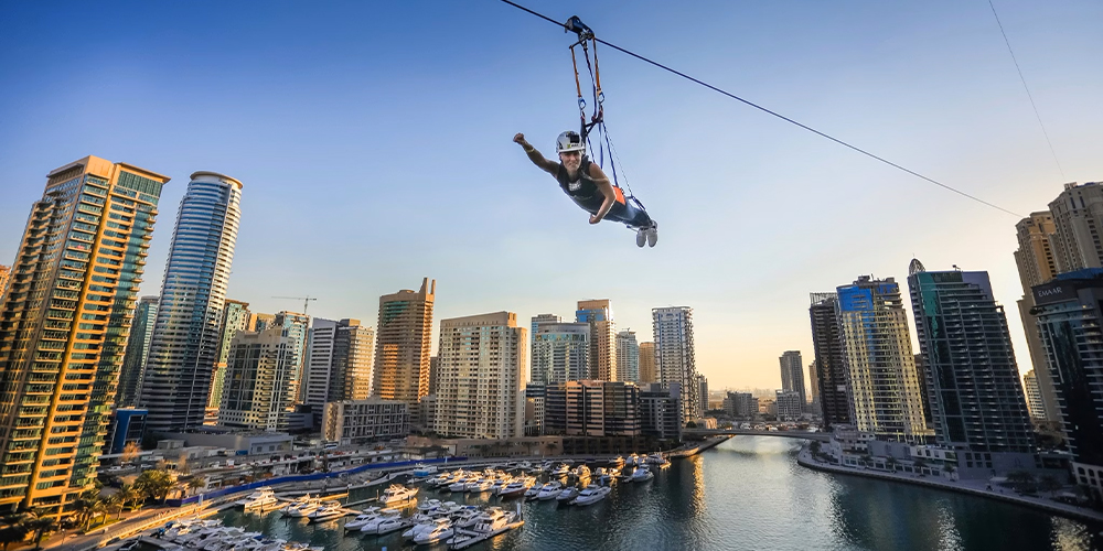 The adventure begins from a height of about 170 meters, where riders launch into a thrilling 1-kilometer descent across the marina. Flying in a “superman” position, you can reach speeds of up to 80 km/h while enjoying panoramic views of the skyscrapers, luxury yachts, and the vibrant waterfront below.
